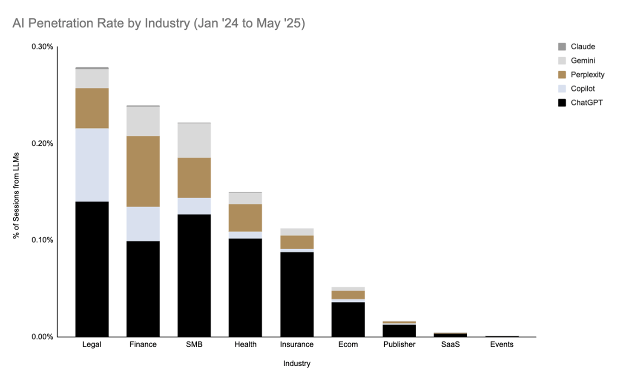 This uptrend isn't uniform across all industries, but high-consultative sectors are leading the charge. Legal, Finance, SMB, Insurance, and Health collectively accounted for 55% of all LLM-driven sessions, indicating that users are turning to AI for complex, contextual questions. This suggests that AI platforms like ChatGPT, Perplexity, Claude, and Gemini are rapidly becoming a "front door to commerce", revolutionizing the customer journey.