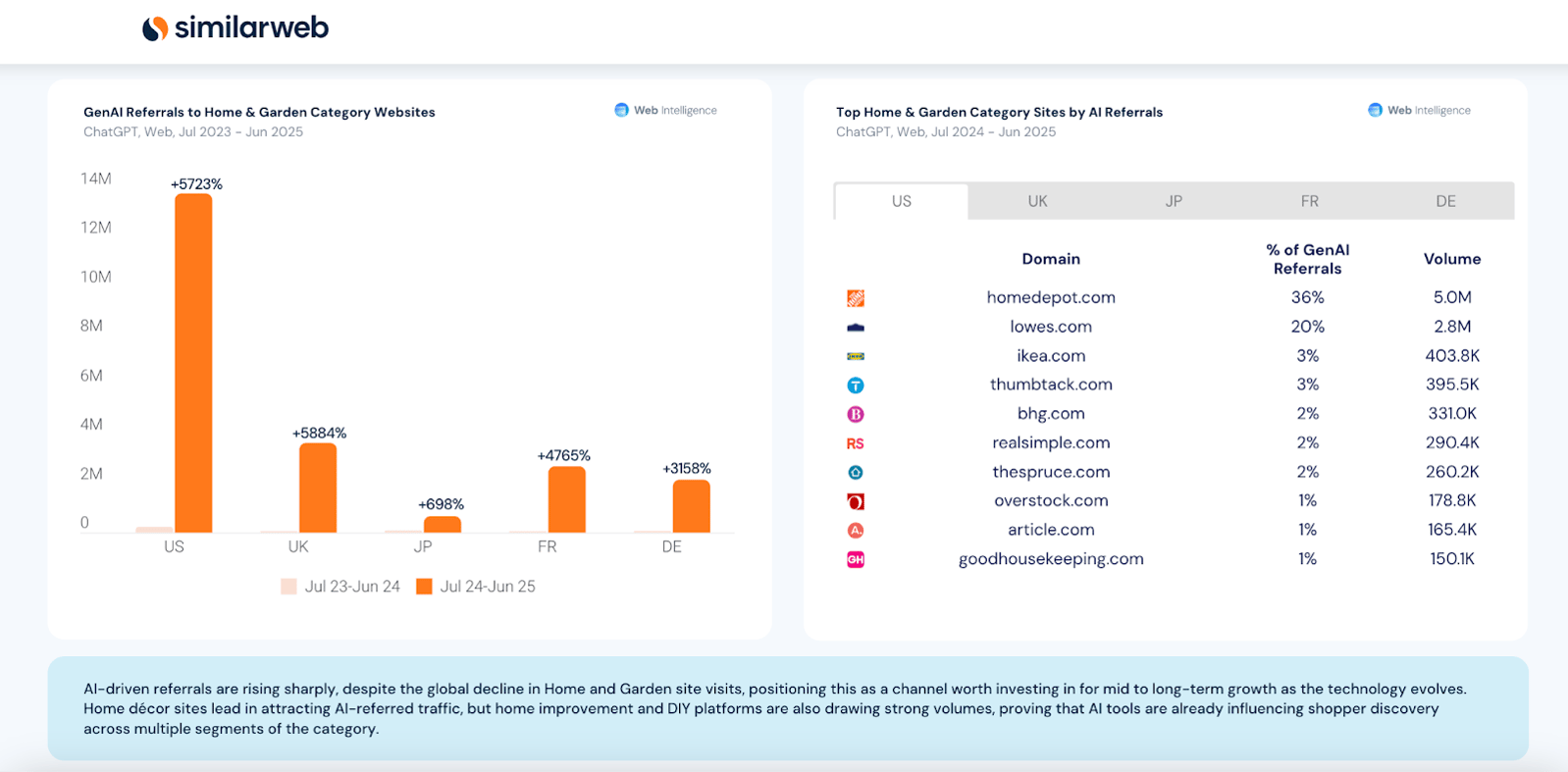 The Similarweb data from July 2023 to June 2025 shows that GenAI referrals to Home & Garden websites in the US have skyrocketed by an incredible +5723% year-over-year.